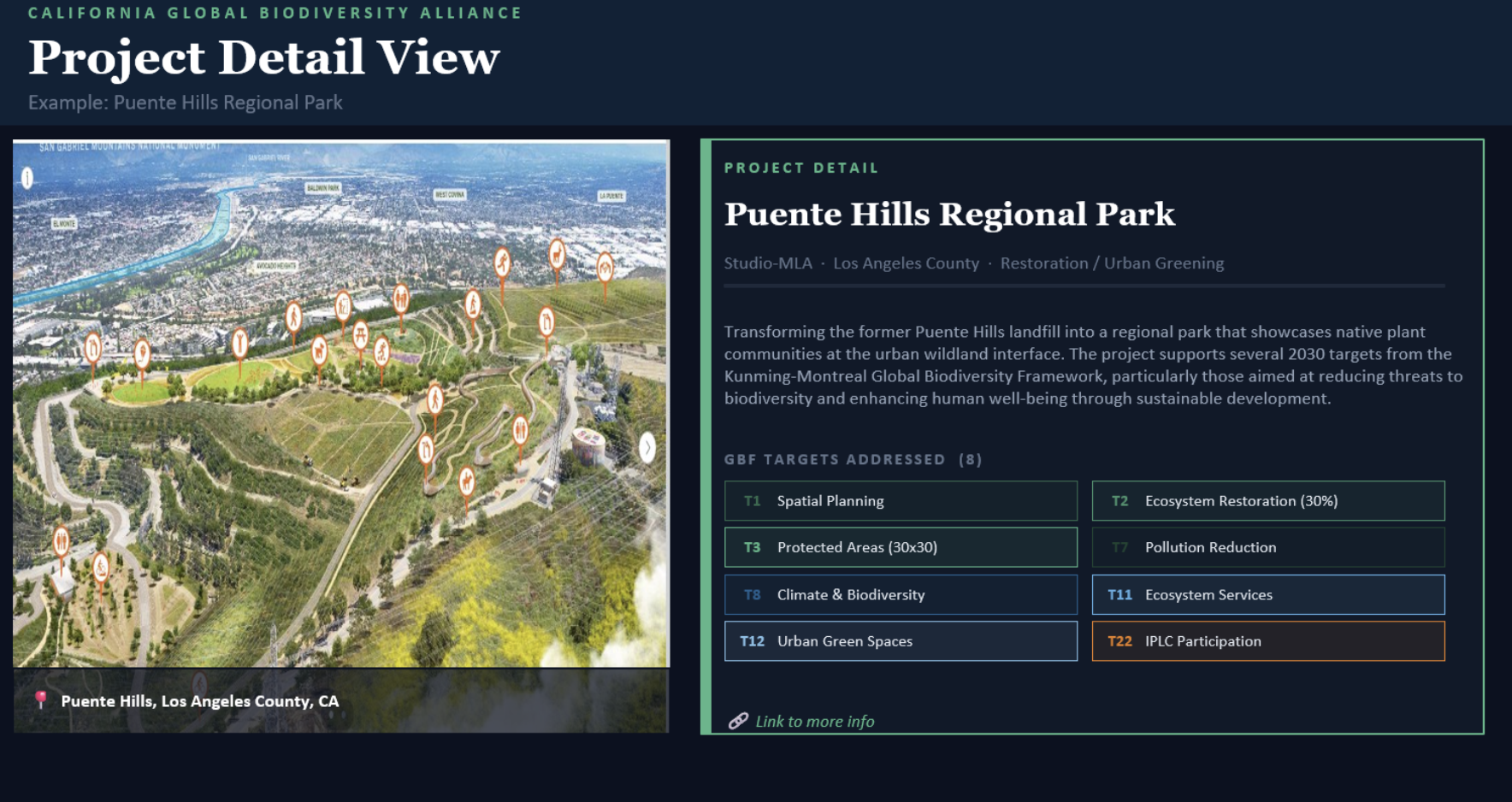 The California Global Biodiversity Alliance (CalGBA) activates collective action by building coalitions and promoting collaboration among local, state, national, tribal and global biodiversity leaders in California, the United States, and around the world in order to overcome critical biodiversity and climate change challenges. In California and across the US, CalGBA partners for mainstreaming and integration of biodiversity objectives in policies and planning at all levels of decision making and governance. CalGBA collaborates with Californians, global NGOs and subnational governments to engage with the UN Convention on Biological Diversity and the Kunming-Montreal Global Biodiversity Framework, the baseline for a rights-based approach for healthy people and planet.